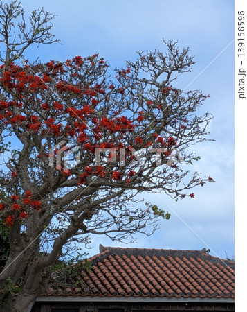 沖縄、青空に満開のディゴの赤い花 沖縄風景