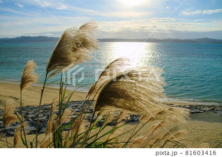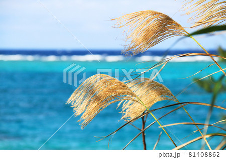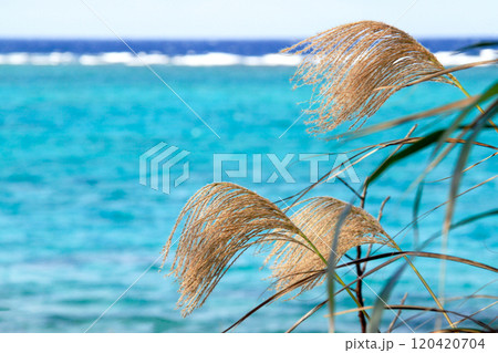 沖縄 黄金のススキが風に揺れる秋の古宇利島