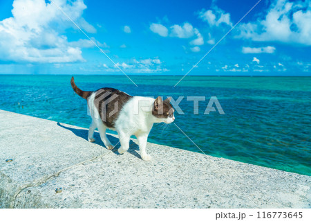 沖縄県の竹富島にて、青い海を背景にリラックスするネコ