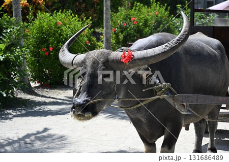 竹富島 ハイビスカスのリボンをつけた水牛