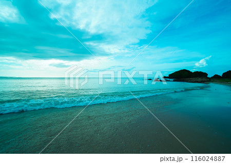 ブセナ海中公園の白い砂浜と青い海 沖縄県名護市