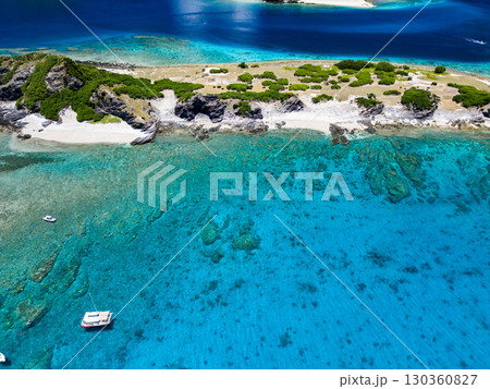 嘉比島のドローン撮影。白砂のビーチに観光客が上陸。 パラソルが立ち、ボート、サバニが停泊している