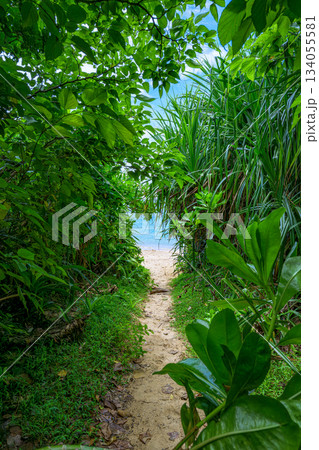 熱帯植物に囲まれた細い道が続く石垣島の自然の風景