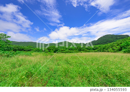 青空と緑の山々が美しい石垣島の爽やかな夏の風景