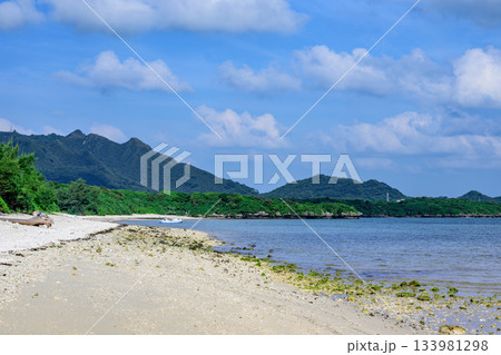緑の山並みと青空が美しい石垣島の海辺で過ごす夏の時間