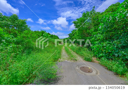 鮮やかな青空と緑の小道が続く石垣島の亜熱帯の風景