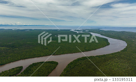 Aerial drone of wetlands with mangroves and swamps. Menumbok forest reserve. Borneo, Sabah, Malaysia.