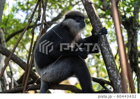 A monkey breed Mantled guereza sits on a branch of a liana.