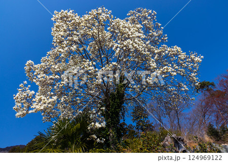 埼玉県秩父郡東秩父村大内沢 早春の里山に花桃が咲き乱れる「花桃の郷」の斜面に咲く一本のハクモクレン