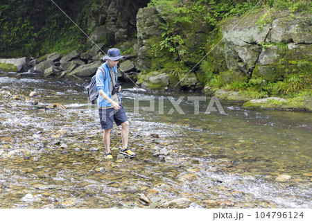 川の中を歩く若い男性 沢登り 沢歩き アウトドアイメージ