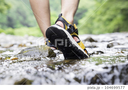 川の中を歩く若い男性足元 沢登り 沢歩き アウトドアイメージ