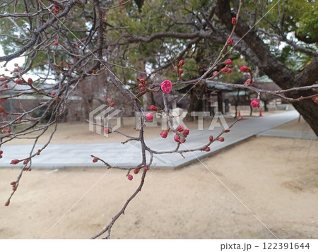 神社の境内を背景に下向きに伸びた枝に咲き始める花と蕾