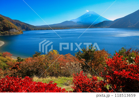 10月の秋晴れに映える富士山と富士河口湖の美しい絶景風景
