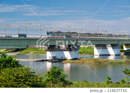大和川を渡る近鉄南大阪線の通勤電車