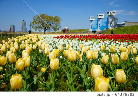 都市農業公園の河川敷に咲くカラフルなチューリップ畑と青空 水門