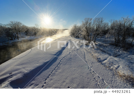北海道東部 道東の風景 霧氷 極寒の朝 霧氷に覆われた堤防の河畔林