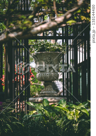 Classic Stone Urn Planter Inside Black Iron Pavilion in Lush Garden