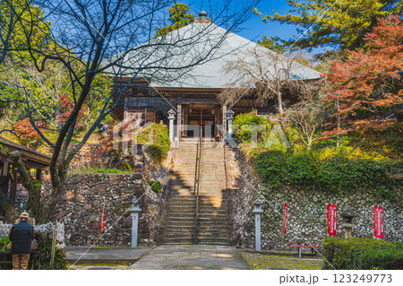袋井市にある紅葉に包まれた油山寺の薬師堂の風景(静岡県)