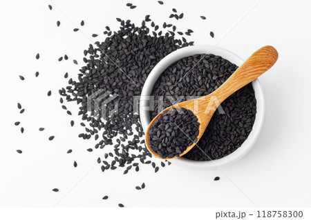 Black sesame seeds in white bowl with wooden spoon isolated on white background