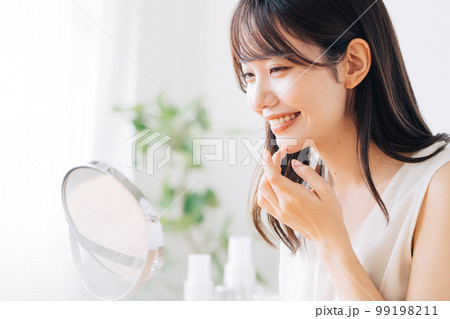 鏡でお肌のチェックをする笑顔の女性