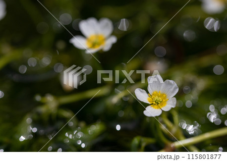〔福井県越前市・7月〕澄んだ水の中にしか自生できない、貴重な梅花藻の花(福井県「治左川」にて)