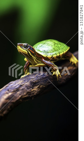 Colorful turtle resting on a branch with lush green background in a vibrant nature scene