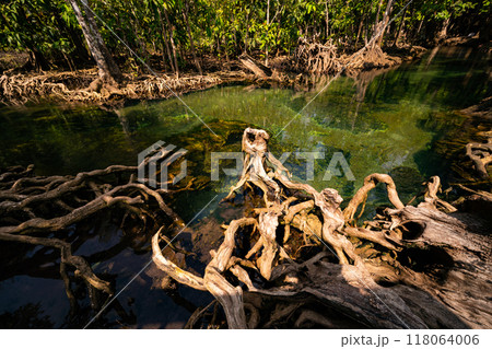 Tropical trees roots in swamp forest and crystal clear water stream canal
