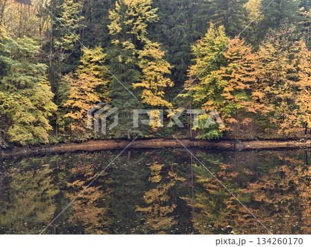 bright trees mirror calm water, colorful trees reflected in peaceful water with stark backdrop