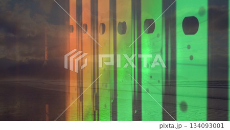 Displaying translucent color bands overlaying shoreline at dusk, with round cutouts, dot motifs