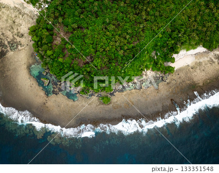 Tidal pools along rocky coastline with dense green tropical forest. Siargao, Philippines.
