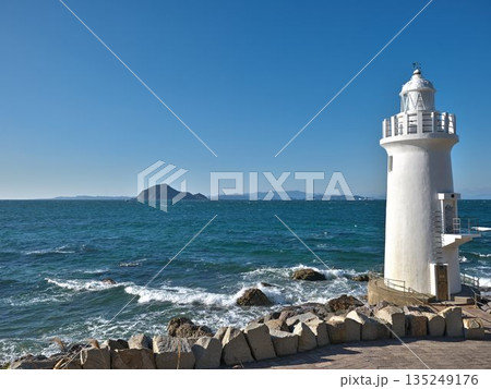 伊良湖岬灯台と三河湾の青い海 快晴の太平洋に立つ白い灯台