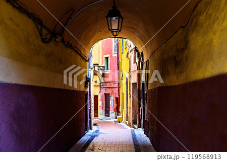 Colorful streets of the historic center of the city of Menton on the French Riviera, Cote d'Azur, France