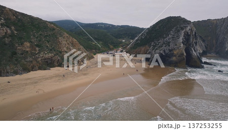 Portugal, Lisbon: Praia da Adraga beach in Portugal wide sandy shore, Atlantic Ocean waves, and rugged cliffs under a cloudy sky, with people enjoying the coastal landscape. Aerial drone flight
