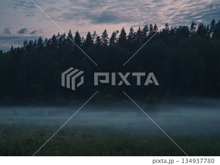 Fog drifts across a grassy meadow at daybreak.