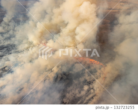 Aerial photo of wildfire in field. Clouds of smoke of wildfire burning dry grass in spring
