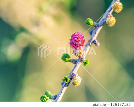 Larch tree fresh pink cones blossom at spring on nature background