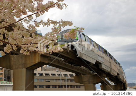 The Tokyo Monorail train passing Sakura cherry blossoms by the canals in Shibaura near Tokyo Bay Japan