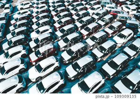Aerial view of new cars parked in car parking lot. Car dealer parking lot full of new automobiles. New cars lined up for import and export business.