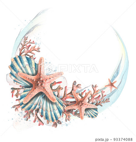 A semicircular frame with sea corals, seashells, starfish and waves of water. Watercolor illustration. For registration and design of certificates, posters, postcards, ads, logos, beach accessories.