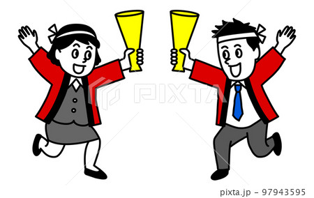 黄色い旗とメガホンを持つ赤色の法被を着た男性と女性の店員のセット