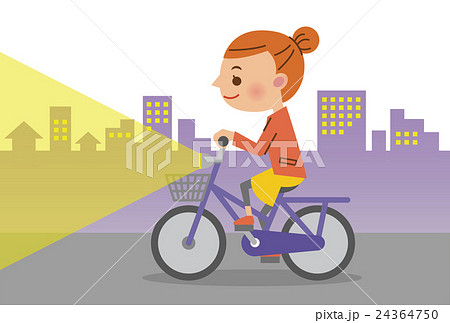 夜間ライトを点灯し自転車を運転する女性(背景あり)