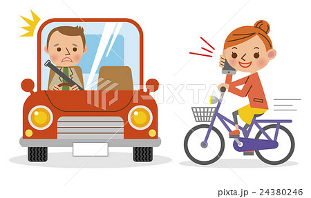 スマをかけながら自転車を運転する男子学生と迷惑する自動車運転者