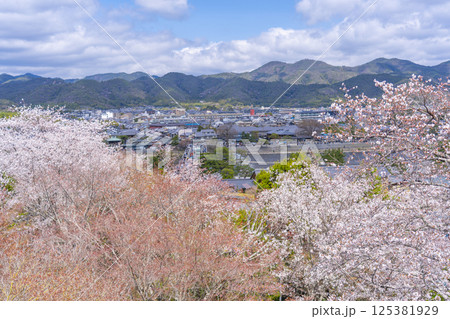 桜咲く法輪寺の展望台から臨む嵐山と嵯峨野方面の風景
