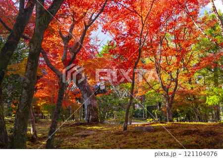 秋の京都 法金剛院 真っ赤に色づいたモミジと庭園へ向かう参道