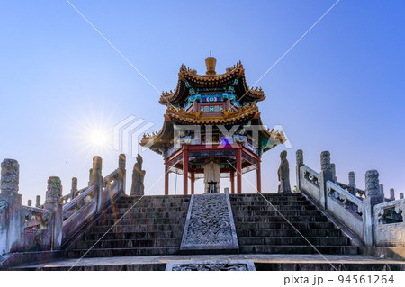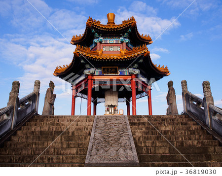 宮廷建築様式「夕焼け光芒を背景に石像・宮廷風景」観光名所:有明の里 泗水孔子公園