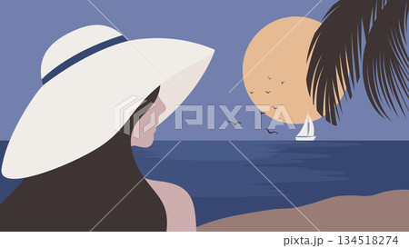 A girl is sitting on the beach on a sunny evening and looking at the sea.