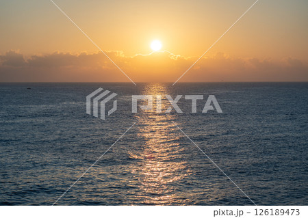 Sunset over the ocean, with the sun low on the horizon, contrast between sky and sea