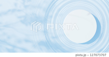 水面に浮かぶ白い円柱の台座。波紋。木の葉の影。俯瞰。コピースペース。3D(横長)