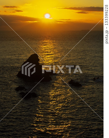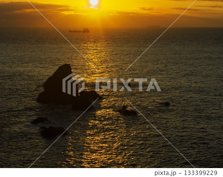 朝日を浴びる大王崎沖のゴリラ岩
