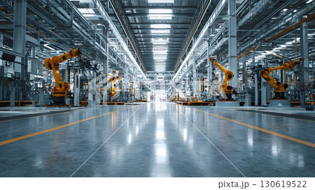 Modern industrial plant with robotic arms idle, symmetrical clean design, cinematic tone